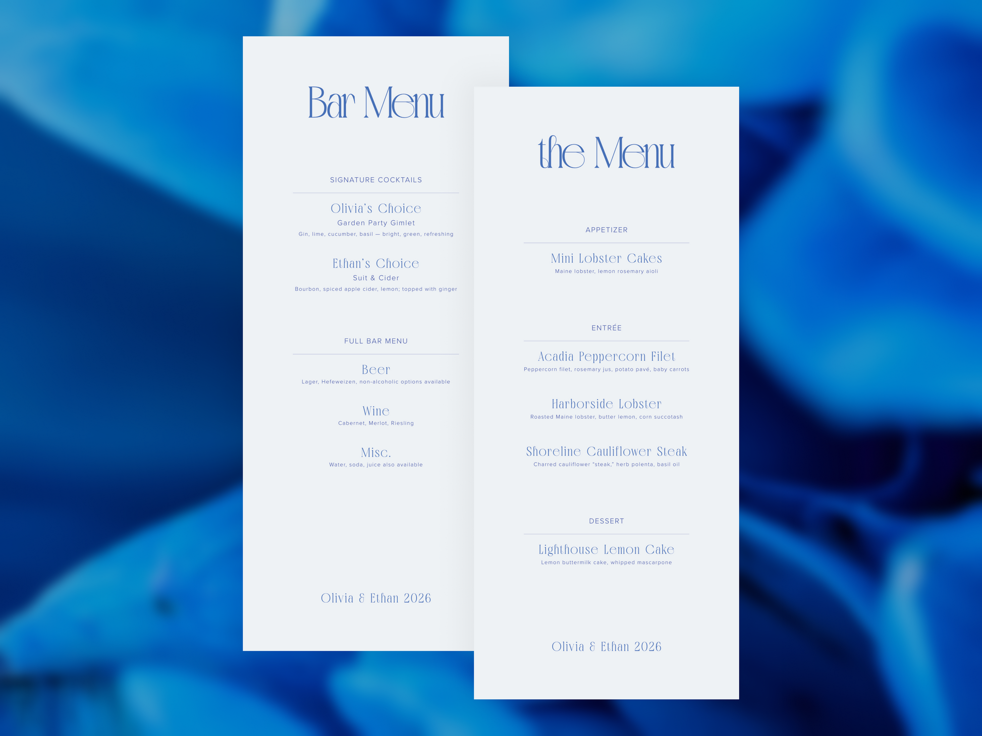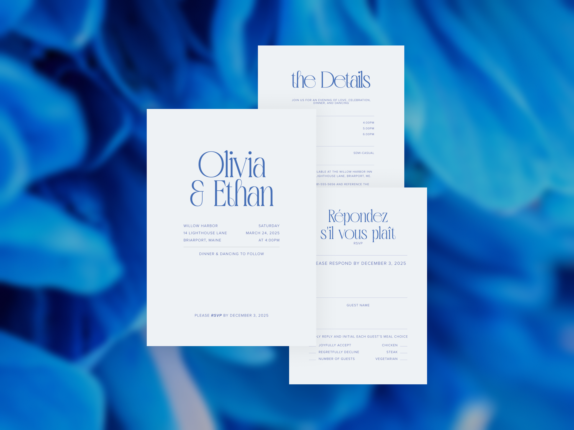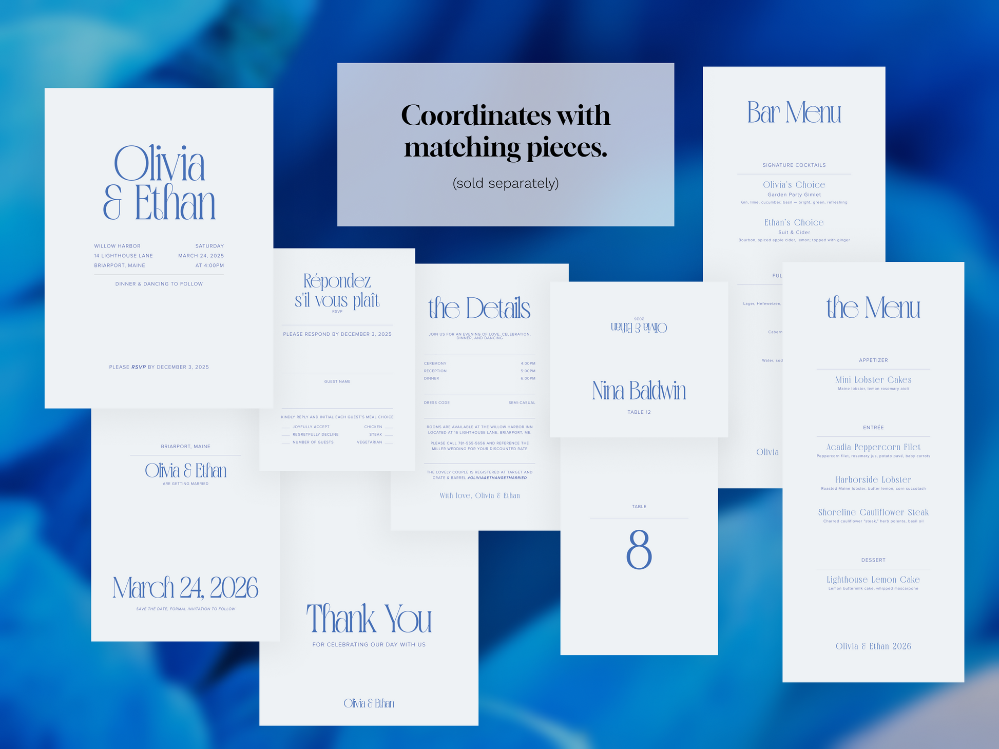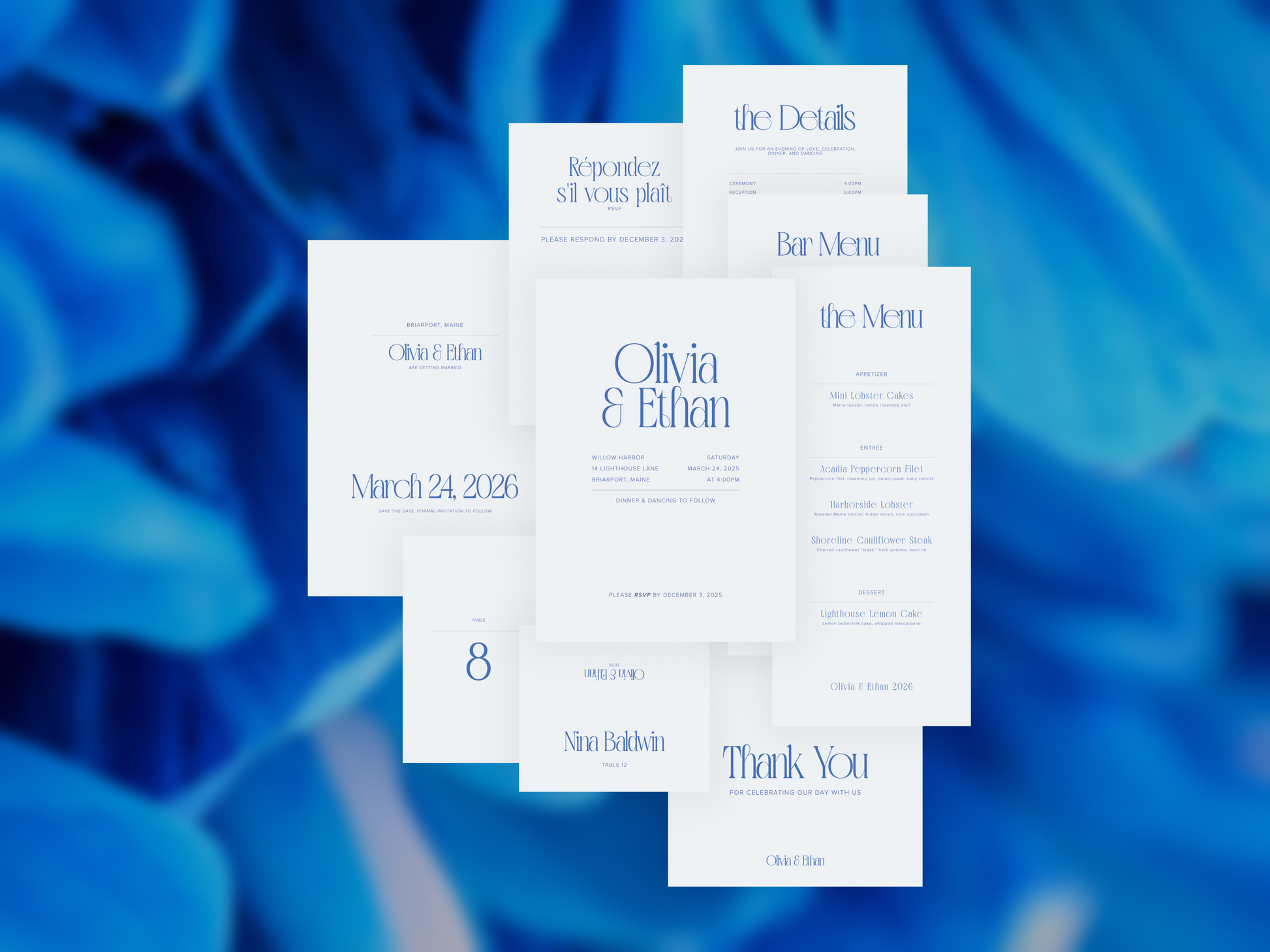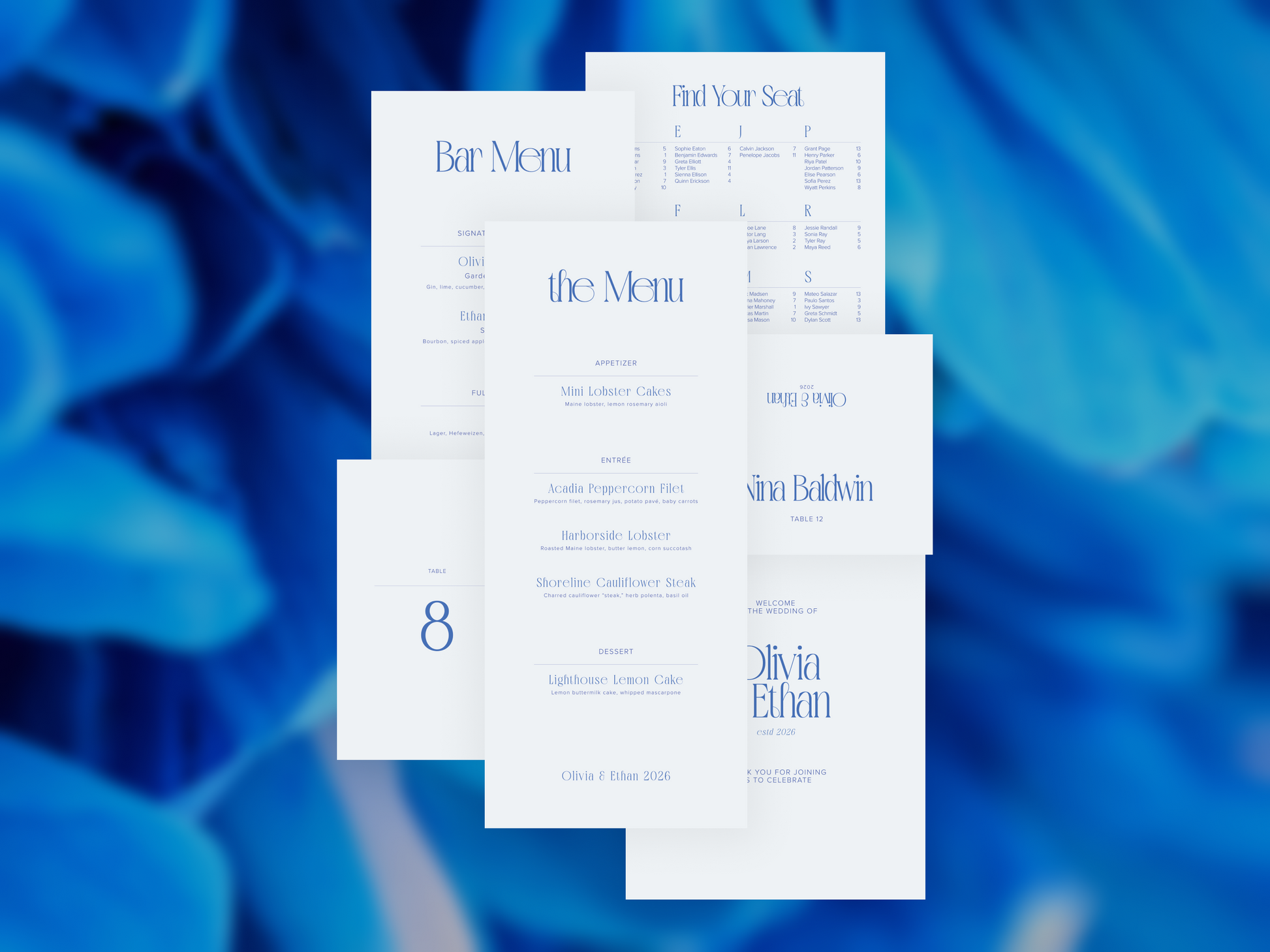 A modern-classic suite with graceful typography and refined spacing, designed to feel effortless, elegant, and timeless. Choose your package on this page—Essentials, Day-Of, or Luxe—then personalize colors, wording, and quantities.