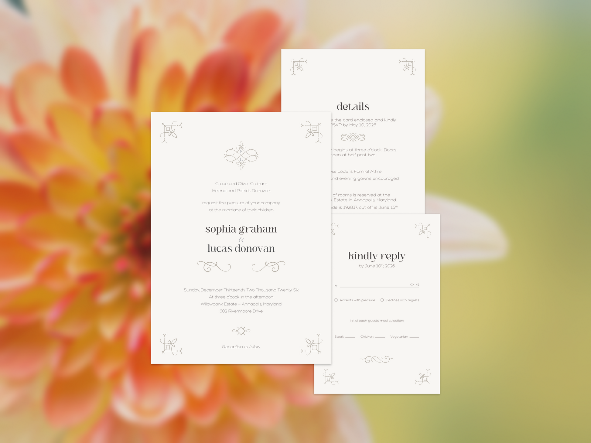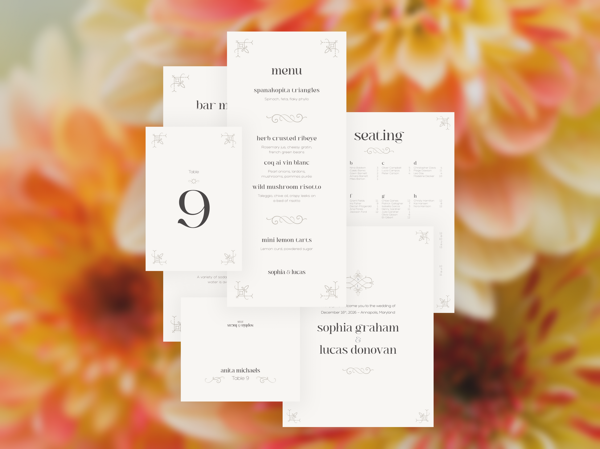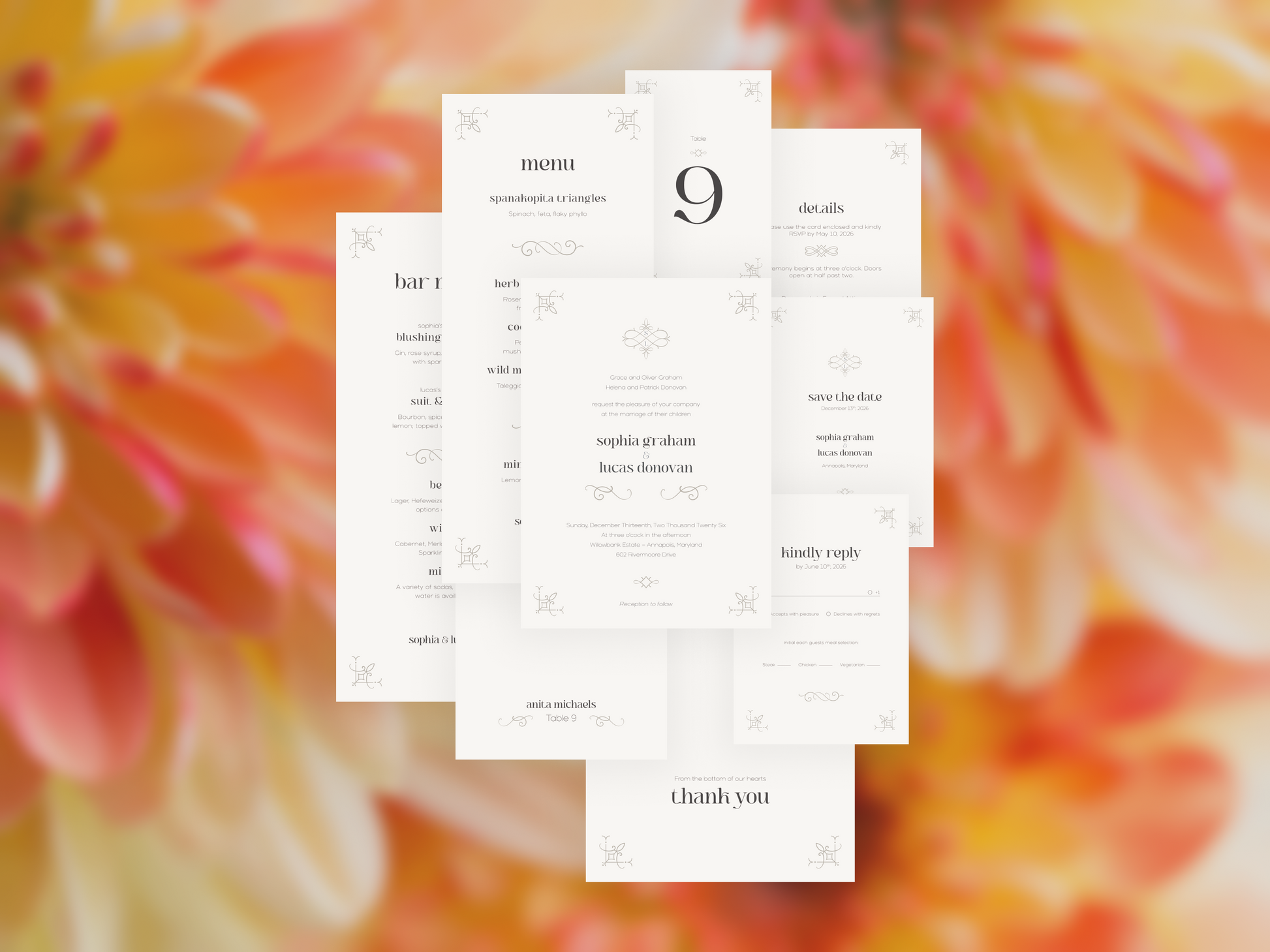 A modern-classic suite with graceful typography and refined spacing, designed to feel effortless, elegant, and timeless. Choose your package on this page—Essentials, Day-Of, or Luxe—then personalize colors, wording, and quantities.