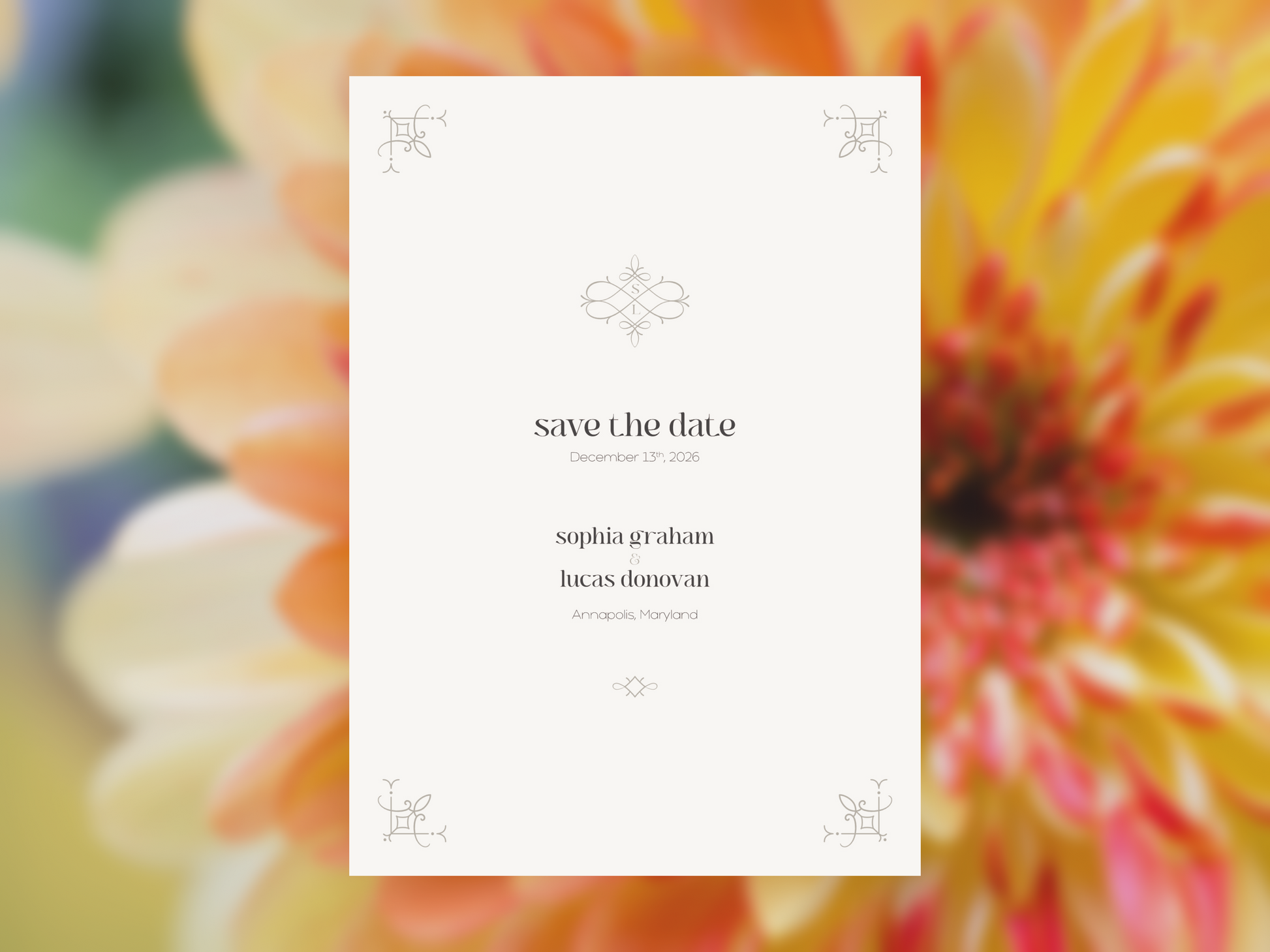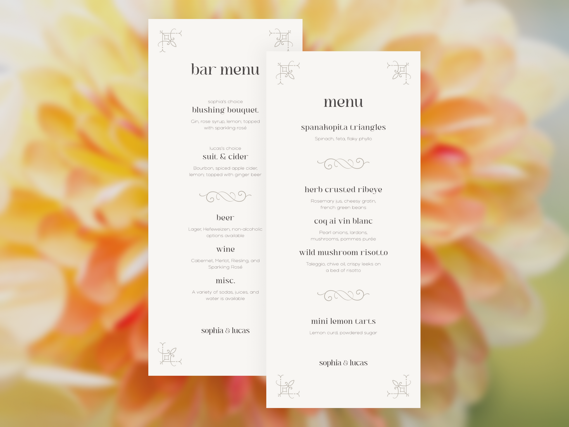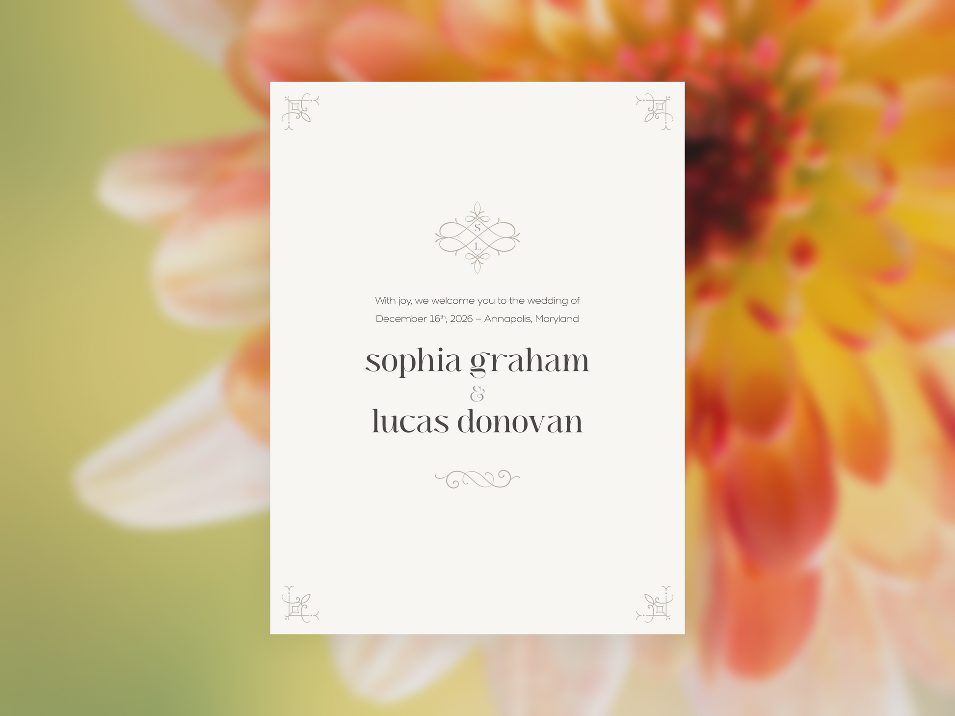 A modern-classic suite with graceful typography and refined spacing, designed to feel effortless, elegant, and timeless. Choose your package on this page—Essentials, Day-Of, or Luxe—then personalize colors, wording, and quantities.